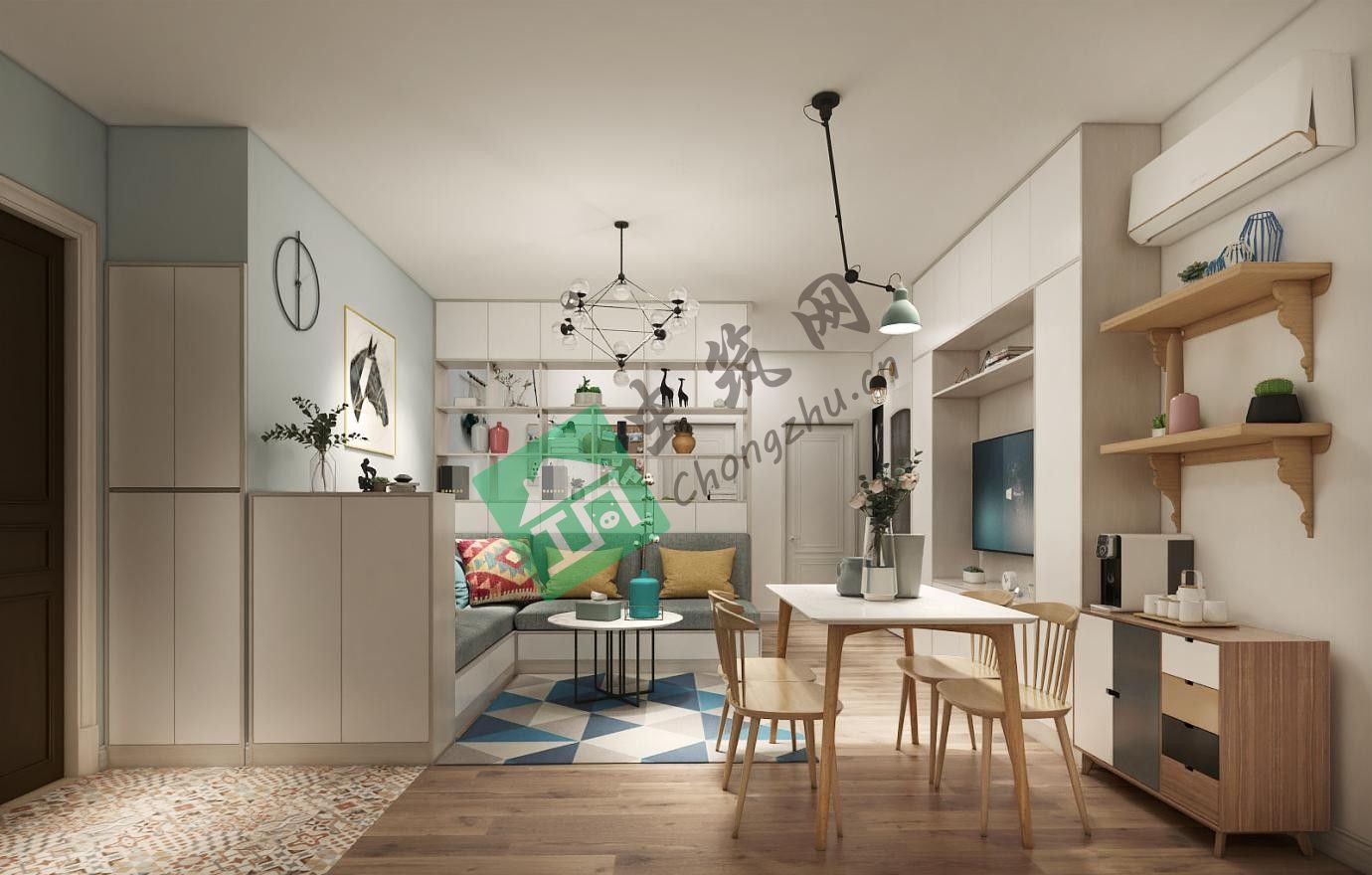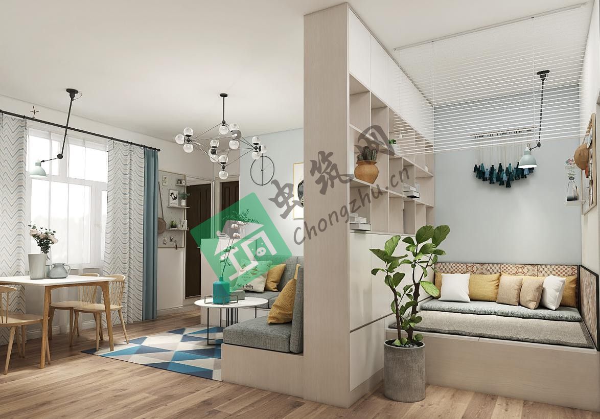 ??原始結構方正,但陽臺及衛(wèi)生間狹小,要滿足四口之家以及給未來孩子首先在客廳空間增加了一個榻榻米空間,作為男孩房使用,在廚房增加洗衣區(qū),增加居家功能,主臥室陽臺改造書房及晾曬區(qū)。其次,60平的房子考慮更多的是儲藏,訂制沙發(fā)、電視功能柜,榻榻米,衛(wèi)生間、臥室都充分的做了分類的儲藏空間。的舒適空間,需要在戶型進行局部調整及改善。門廳作為入戶第一個功能區(qū),穿衣鏡、掛衣服的位置,讓入戶更加的實用和方便.客廳與榻榻米之間用以格子柜劃分兩個區(qū)域,下部分可儲藏衣物,上部分又可以作為裝飾柜,美觀又實用。客廳的窗戶與戶外自然景物銜接,讓自然的光線迎著一個唯美的弧度投灑進來,窗簾在朦朧中交織成一片渾影,好似碧海中前行的帆船倒影,亮閃閃、明晃晃.墻面因海藍色的魅力加持,更顯清新。入戶地面用小花磚和地面錯拼木地板做為劃分,藍色背景墻像是漂洗是被漂洗晾干后天空和深海的顏色,內斂之中夾帶些許孤傲.電視背景墻用以白色及木色結合的墻柜的形式體現(xiàn),在增加儲物功能的同時,實用及美觀,每一處細節(jié)都是我們設計所考慮的。主臥室綠色背景墻讓空間更顯清新,一幅白色抽象畫給畫面增加了層次感。整體空間簡約又不失優(yōu)雅。本的陽臺,經(jīng)我們精心設計,增加了書房,及晾曬區(qū)的功能,在不影響主臥室采光通風的同時,原來的窗戶設計成書架。高級暖灰木色櫥柜,配以潔白的墻磚,碎灰色地磚,三餐四季就在這一片勃勃生機中流轉,遺忘了時間,無需過多的空間裝點,只需流于平淡和生活。