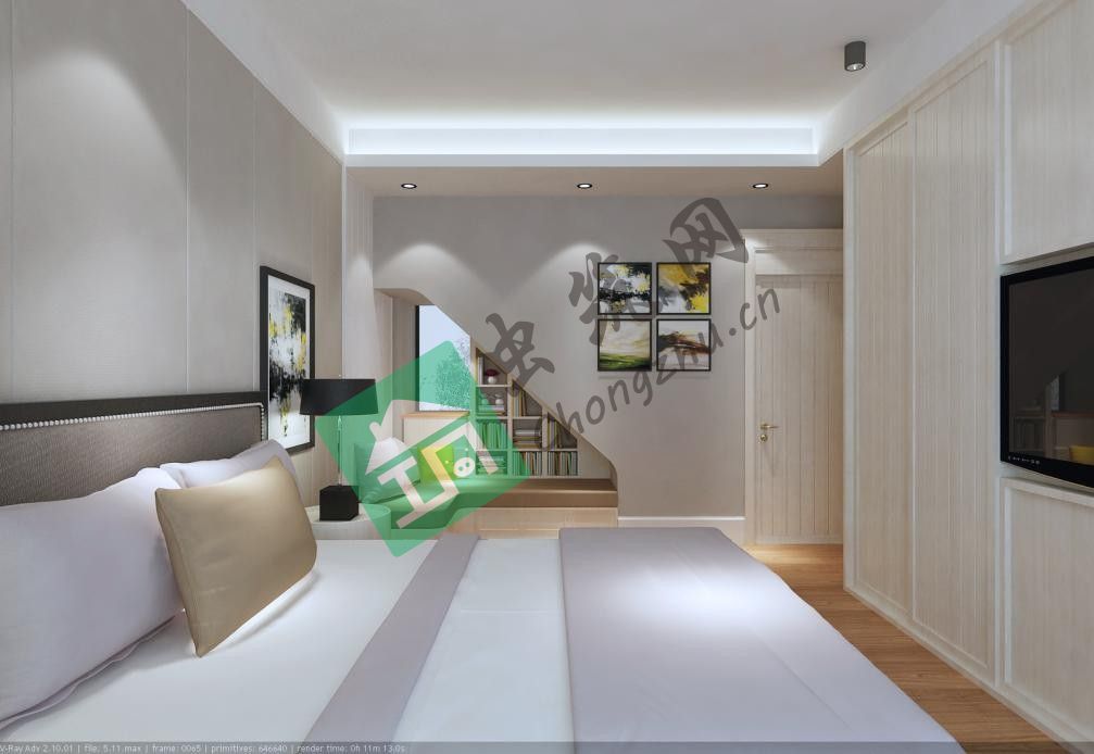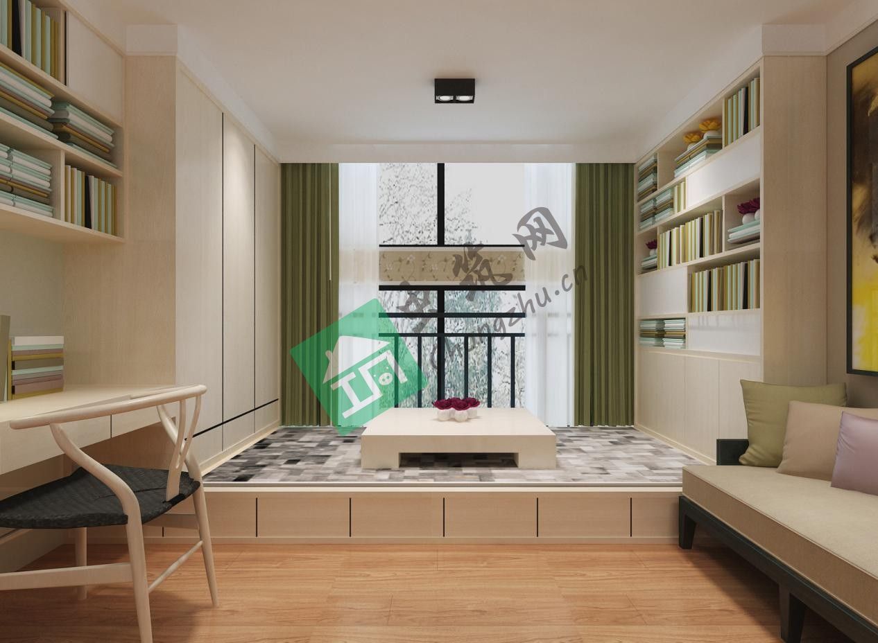 ? 二層書(shū)房做為多功能房可以用于居住、休閑、娛樂(lè)、學(xué)習(xí)。在色彩上用了綠色、黃色色系的搭配,空間感清新具有靈動(dòng)性。