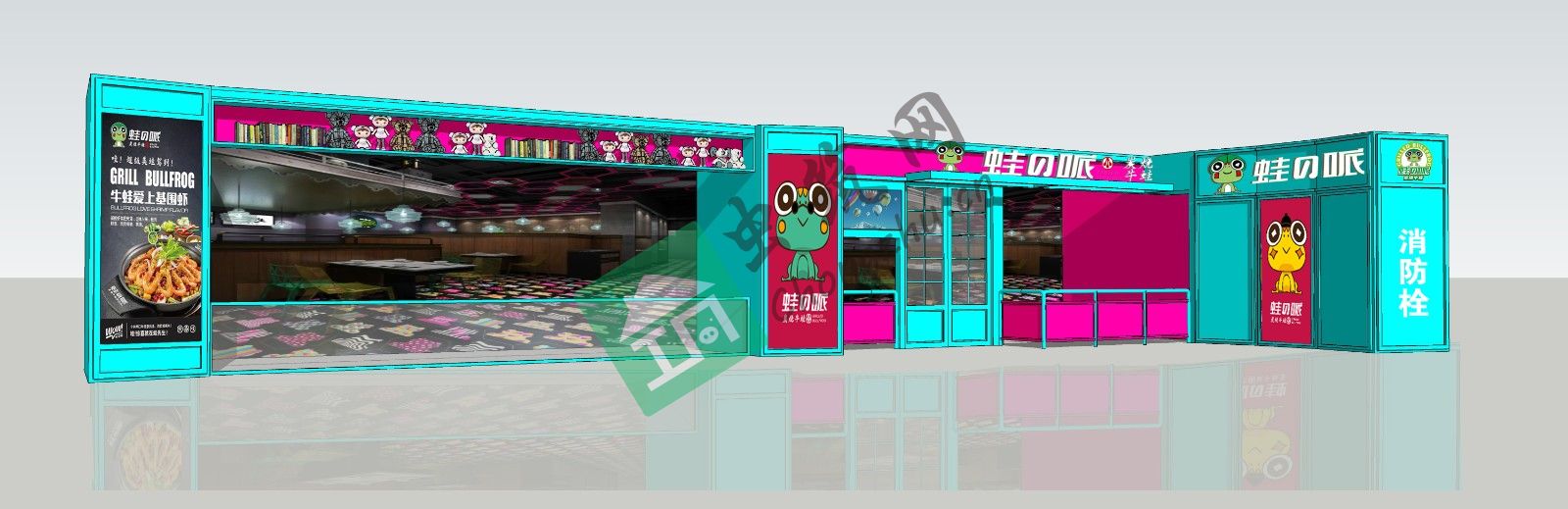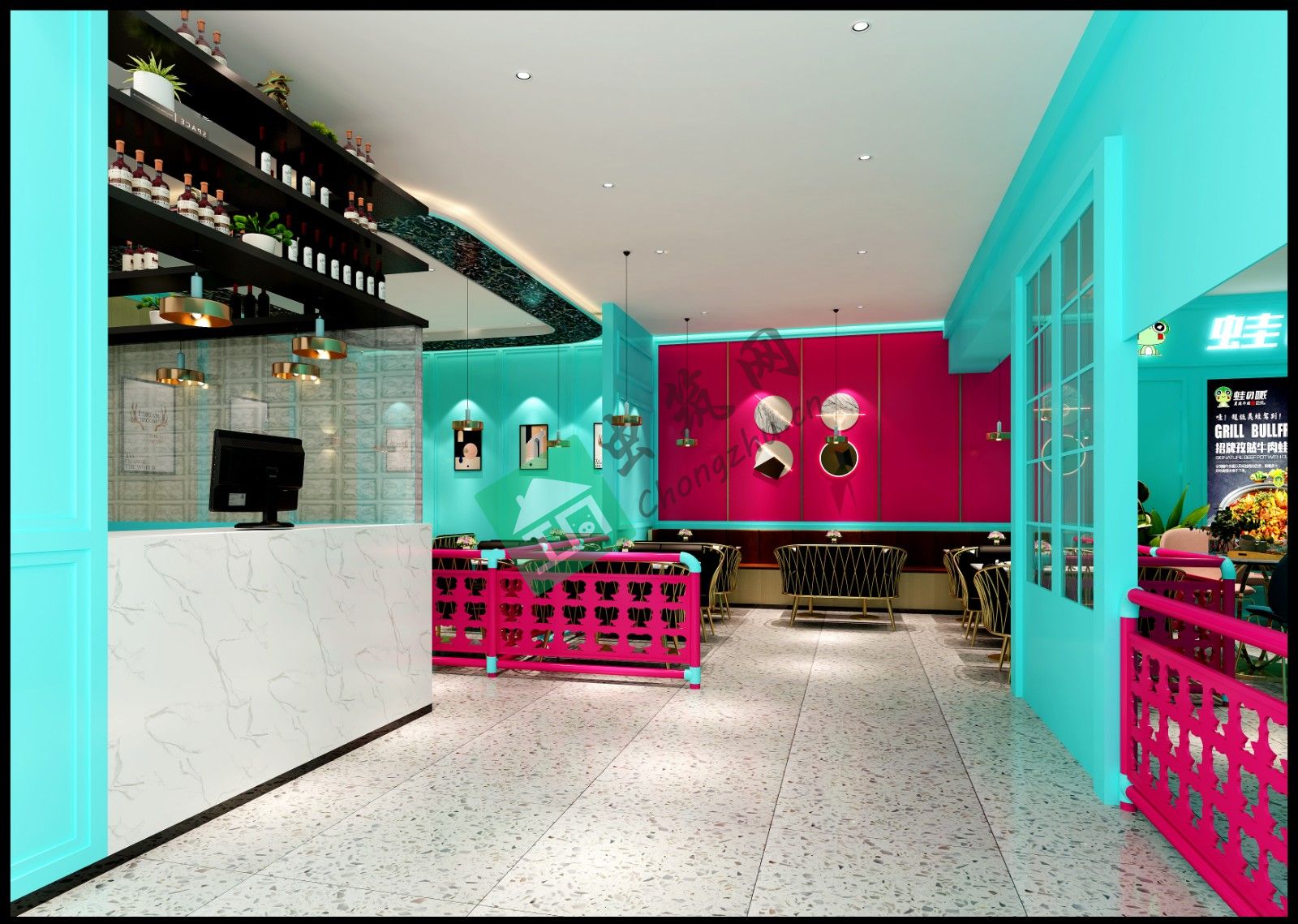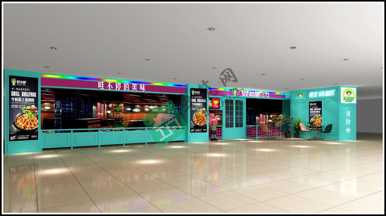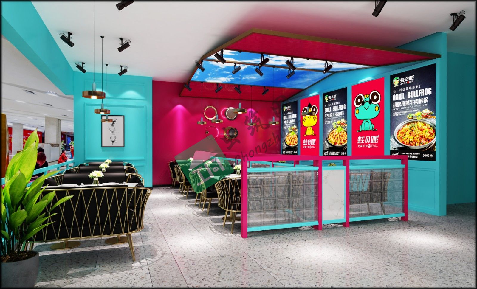 本案例以蛙做為餐廳的主題,通過發(fā)掘蛙的各類做法來滿足都市的食客的不同需求。蛙產(chǎn)品系列的主要顧客定位在18-30周歲的消費(fèi)人群,因此在空間布局和色彩搭配上迎合此年齡段的愛好和需求??臻g布局上通收銀臺的主人流動線將店鋪分為2個大區(qū)域,入門口的左側(cè)區(qū)域?yàn)榈嘏_區(qū)域和卡座隔斷區(qū)域。此區(qū)域?yàn)榈赇伒牧咙c(diǎn)區(qū)域,此區(qū)域采用蒂芙尼藍(lán)為基礎(chǔ)的基色 搭配玫紅色的對比色營造一種活潑 接頭的感覺,局部搭配波普涂鴉形式的蛙形象logo彩繪,重點(diǎn)強(qiáng)調(diào)了品牌屬性。入門口的右側(cè)區(qū)域以大面積的玻璃櫥窗和標(biāo)志性同心圓鋼構(gòu)造型為主要的特色,讓美食通過櫥窗使人駐足,此區(qū)域采用大面積的蒂芙尼藍(lán)