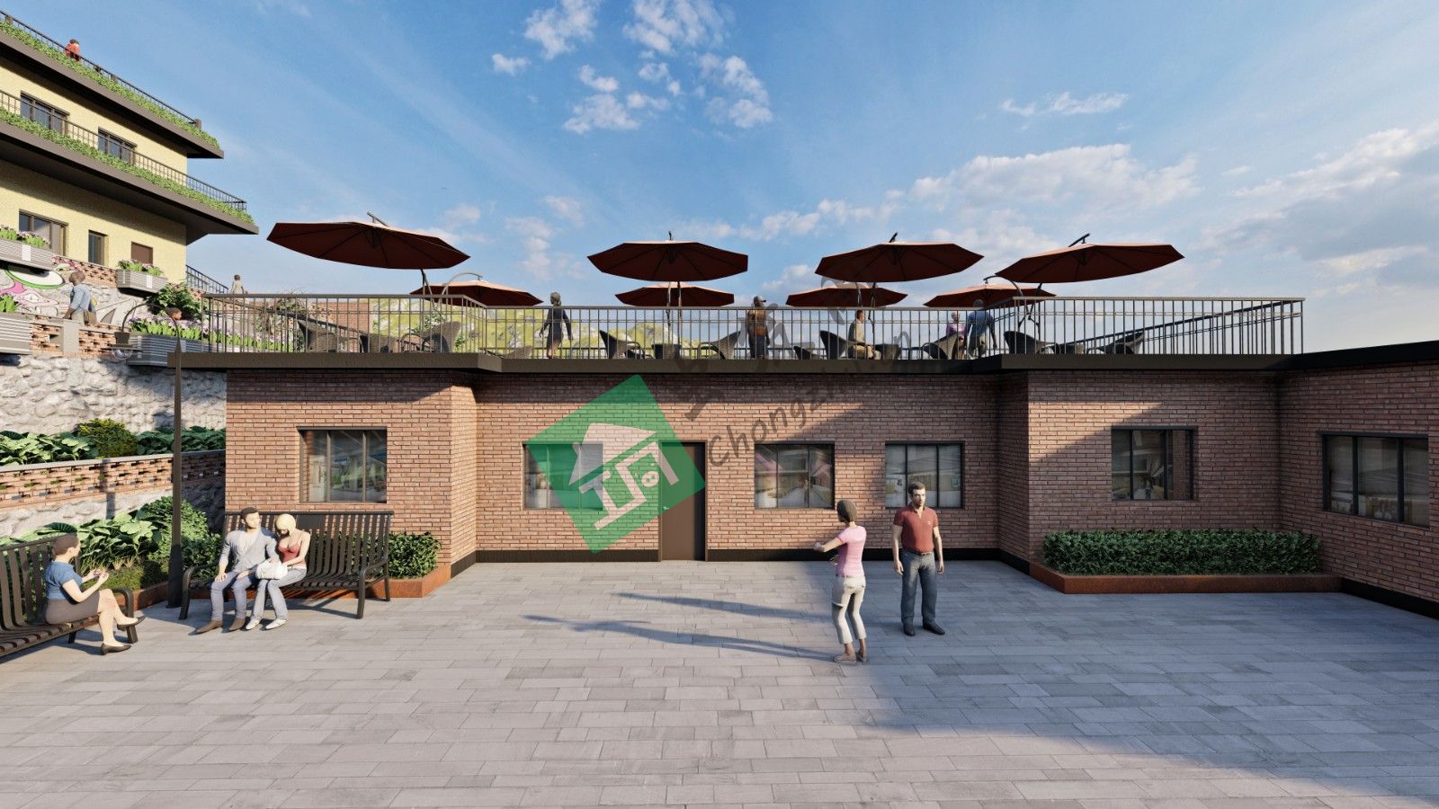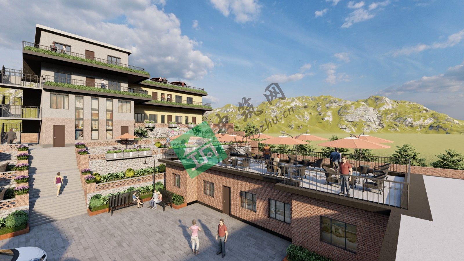 3、桃花谷原有建筑過于殘舊,所以在設計中將建筑重新改造,占地面積擴大。整體建筑風格以紅磚墻為主,以院子形式圍合,結合耐候鋼材落地窗等材料打造,極簡工業(yè)風更具創(chuàng)意。建筑共3棟,分別規(guī)劃為肩帶處、廚房及民宿。院落中心建立休息平臺,為住客提供休閑娛樂場所,院落周圍的景觀綠化設計上,種植桃花及花卉作為點綴,迎合主題的同時營造舒心氛圍。