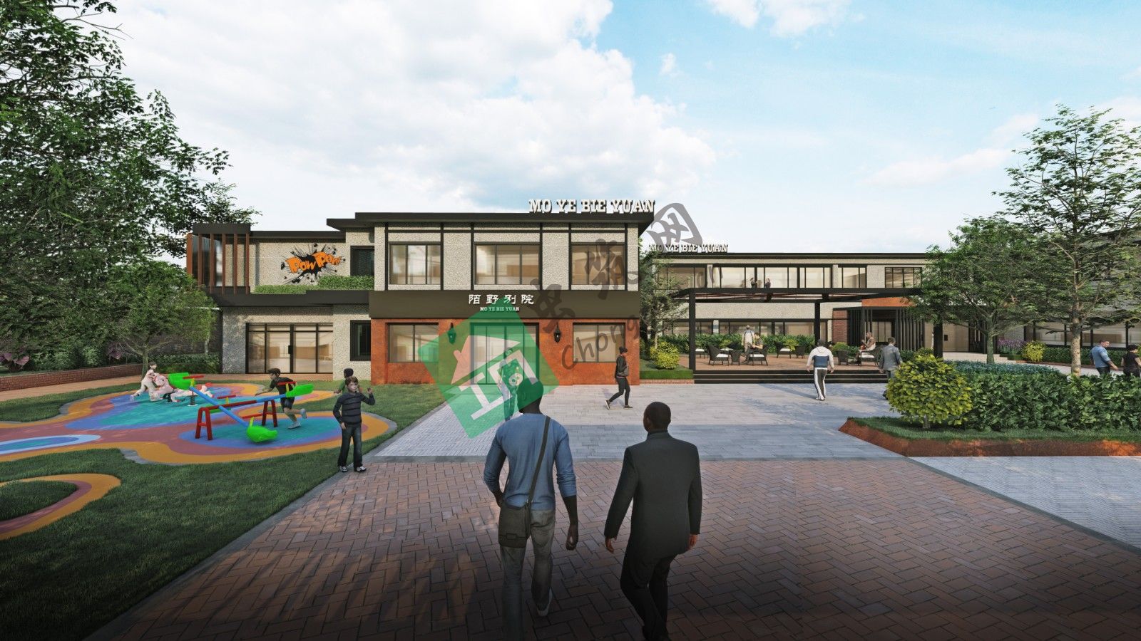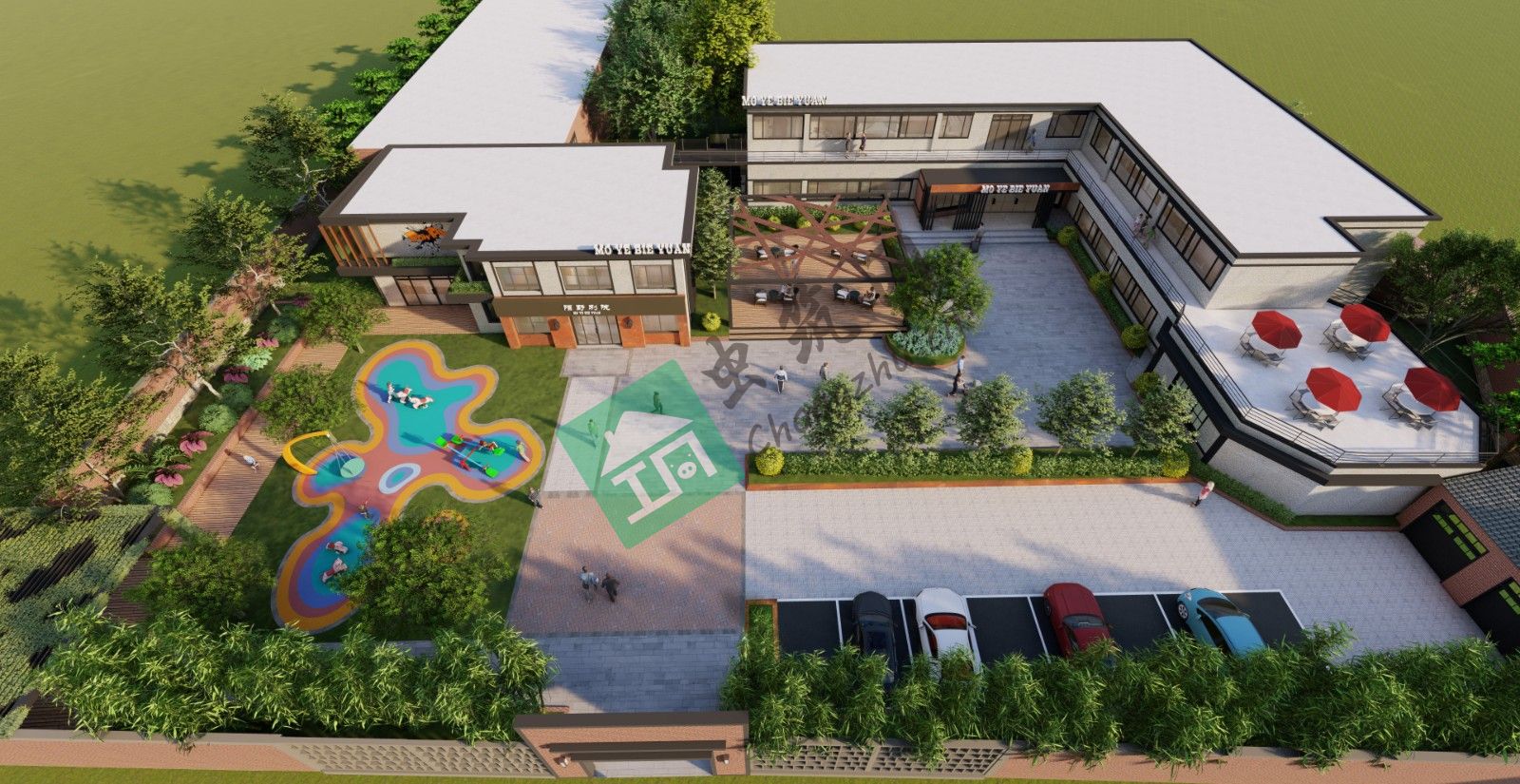 2、幼兒園民宿改造保留原有的建筑外形,將墻里面改造成紅磚,結合鋼結構的加入,保留原有歷史記憶的同時,創(chuàng)造出更具工業(yè)特色的民宿空間,入口右側設立停車位供來客停車;而大門入口左側建立兒童樂園,使整個活動空間更多樣化。廣場中心設立休閑木平臺,為住客提供休閑場所。在兩棟建筑拐角處搭建鋼架天橋,將兩棟建筑貫穿聯系在一起。