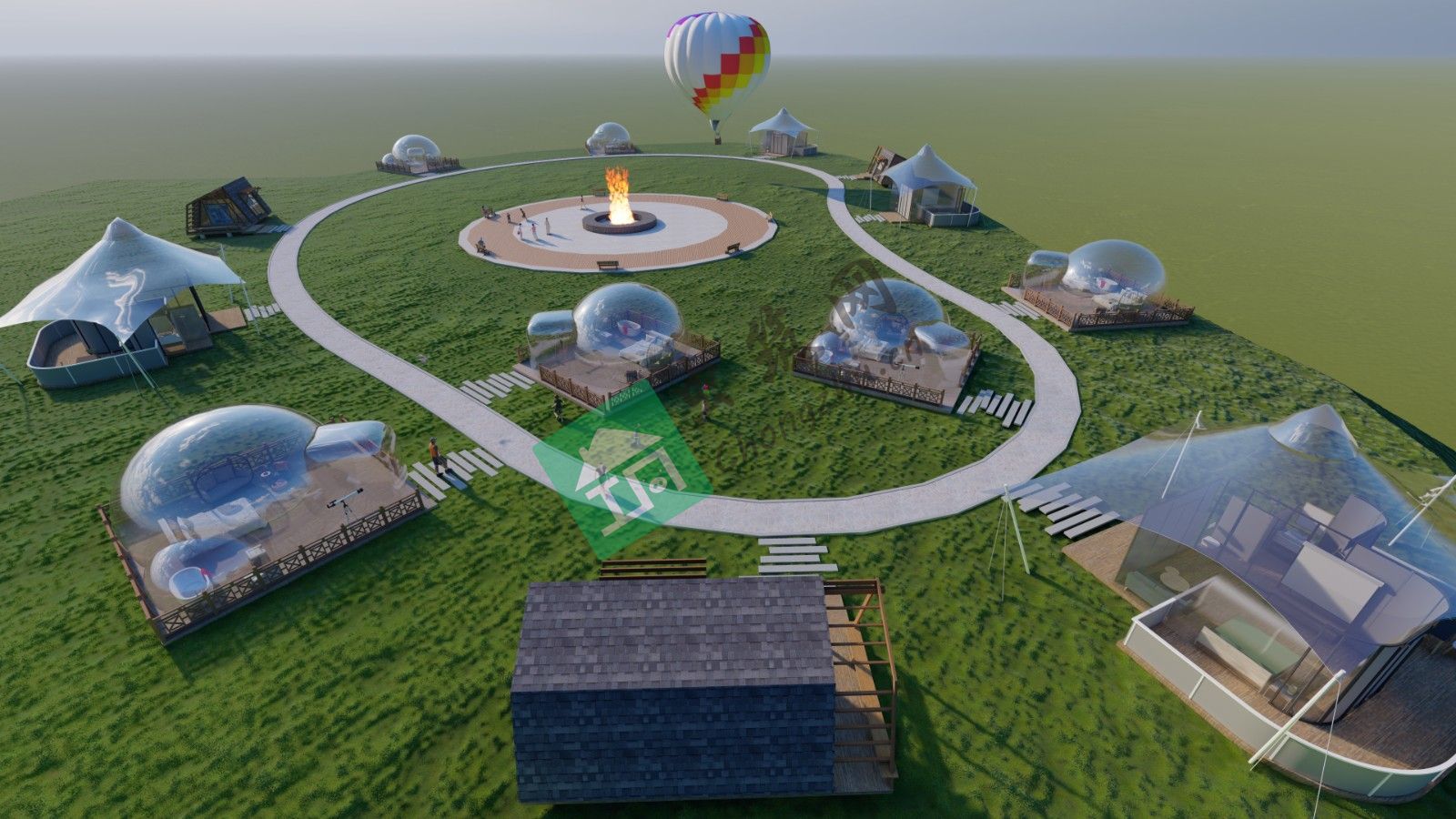 5、二礦渣臺頂面積約4萬㎡,海拔高1455m,空間開闊。民宿設計將泡泡屋均勻分布在二礦渣臺上,猶如墜落山野的孤獨星球,與天空遙想對望,躺在床上便可看到漂浮的白云與碧藍的天空。還有自帶超大露臺,可觀星賞月,聽清風蟲明。平臺中心設立篝火廣場,夜幕降臨還能開展一場盛大的篝火盛宴。