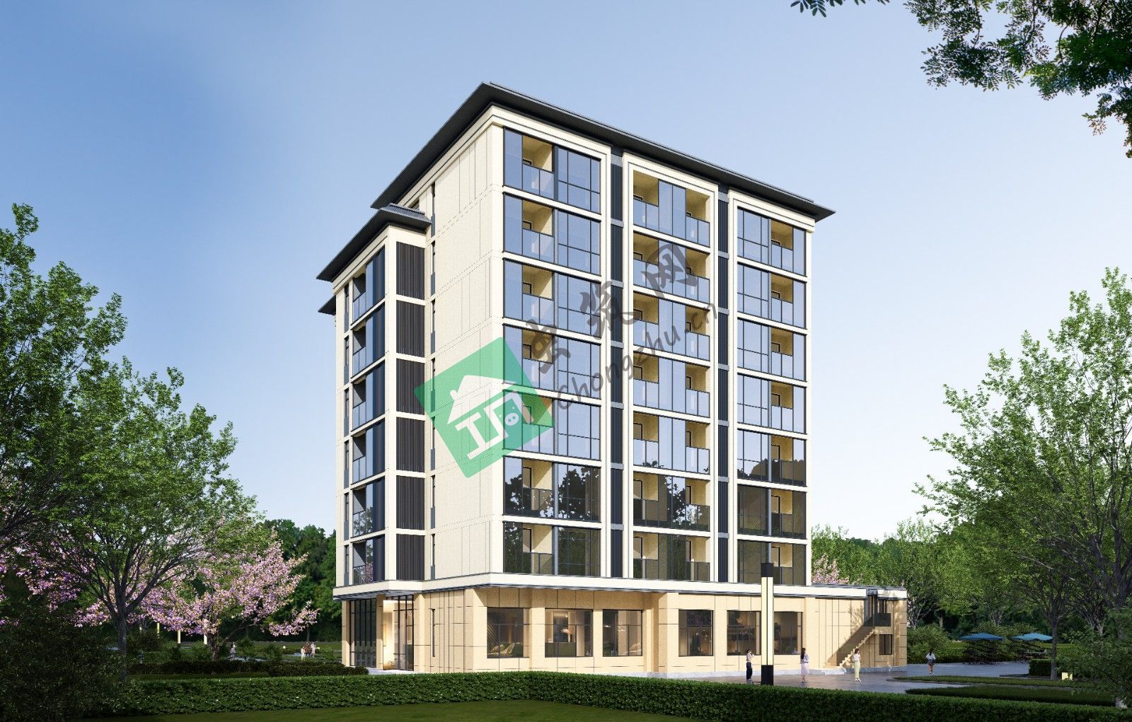 單體建筑采用現(xiàn)代簡約融合地域特色的風格,立面以淺米色與深灰色為基調,搭配大面積玻璃幕墻,塑造簡潔、通透的視覺效果,呼應山林間的清朗氣質。建筑形態(tài)規(guī)整中求變化,通過退臺、錯層設計,豐富天際線,同時為上層客房創(chuàng)造觀景露臺,拓展室內(nèi)外空間互動;底部架空層削弱建筑體量感,引入綠化與休閑功能,讓建筑更好地融入環(huán)境,兼具美觀與實用性。