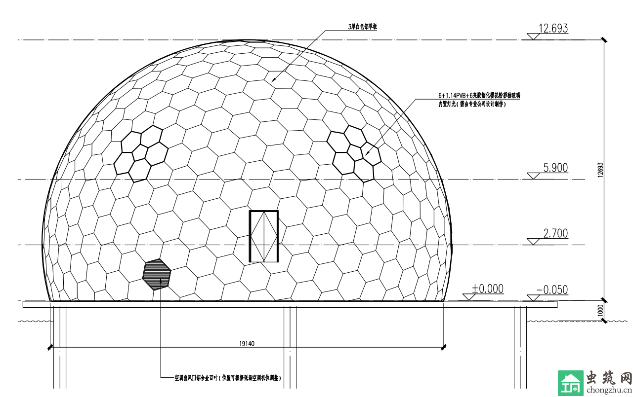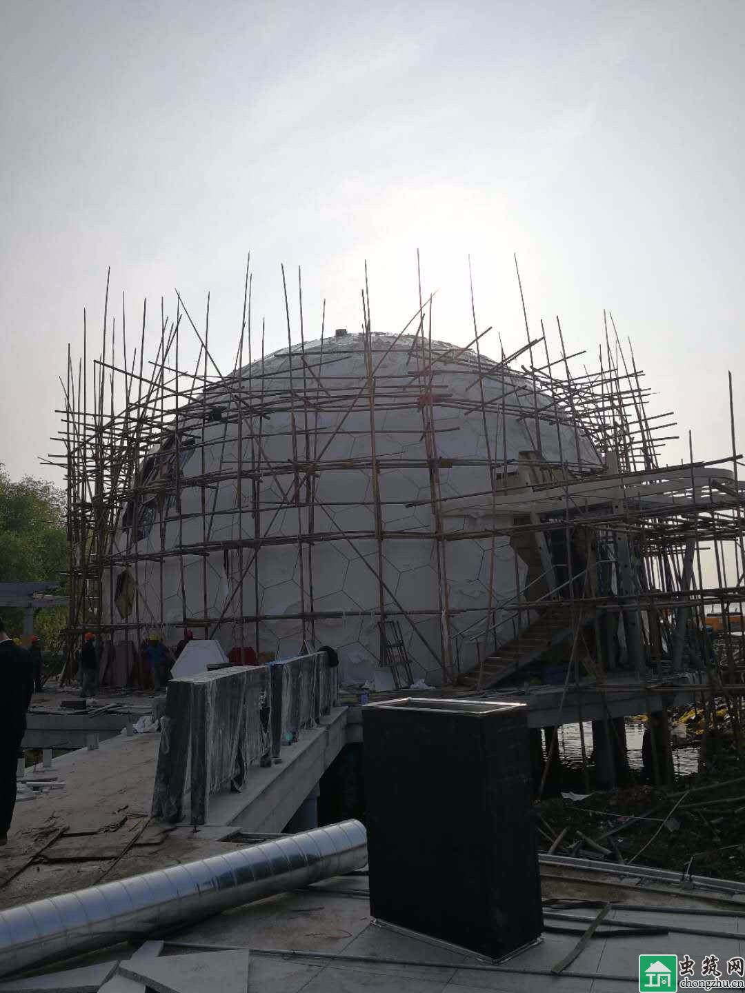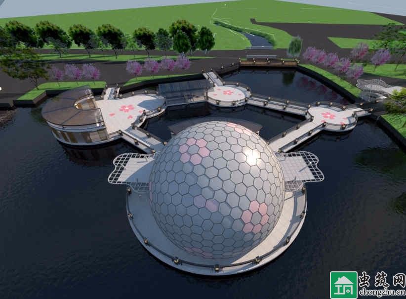 主要功能為櫻花3D影院,鋼結(jié)構(gòu)采用網(wǎng)架球結(jié)構(gòu),外表面采用鋁板形式,通過(guò)三維建模放樣,實(shí)現(xiàn)鋁板加工制作及安裝。